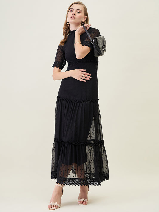 Dobby Mesh Tiered Maxi Dress with Lace Trim