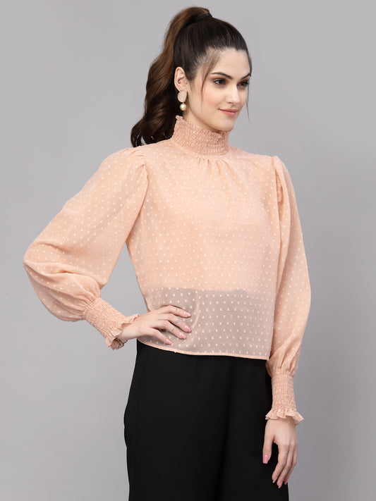 Polka Dot Sheer High Neck Blouse with Shirred Cuffs