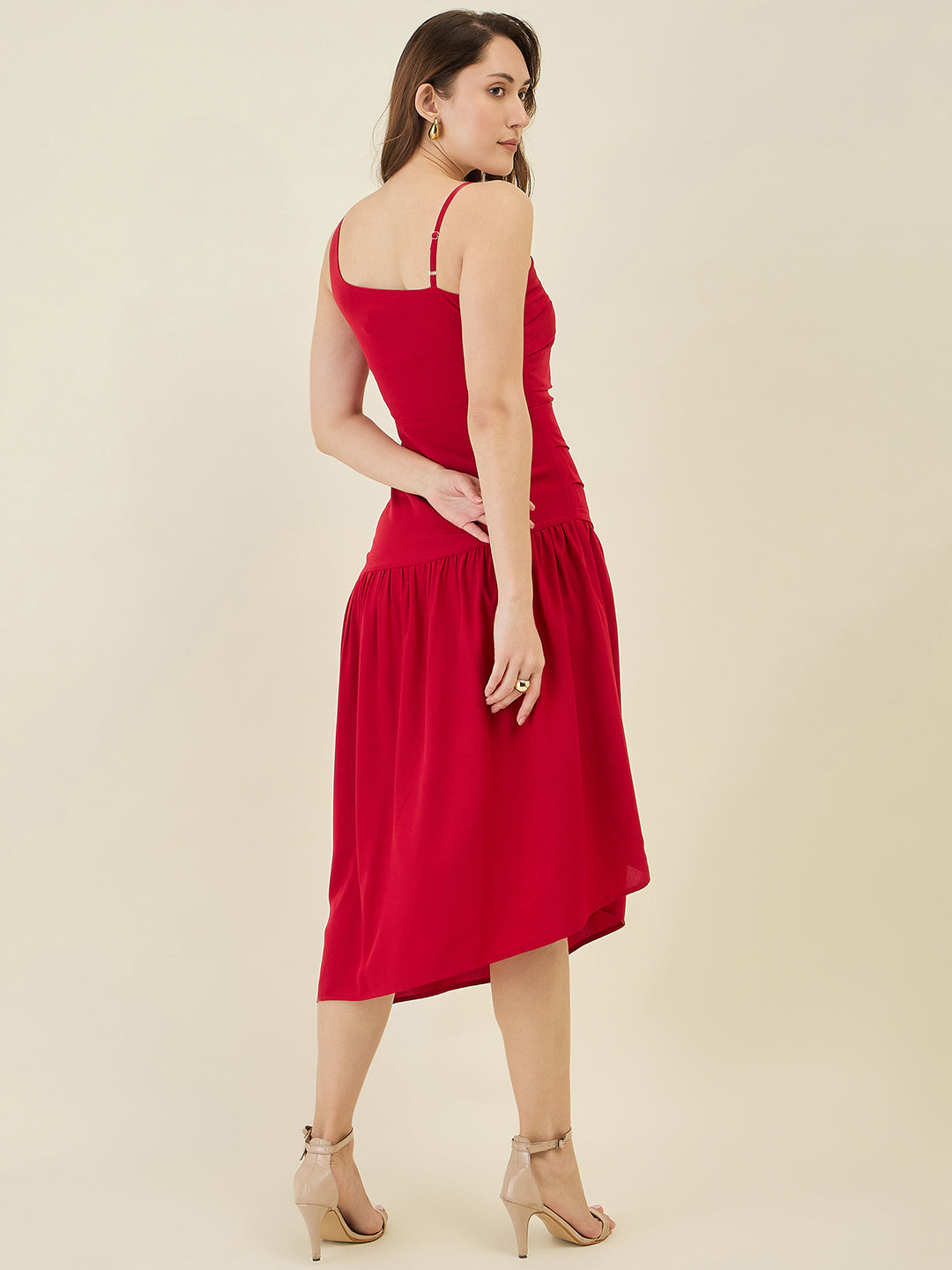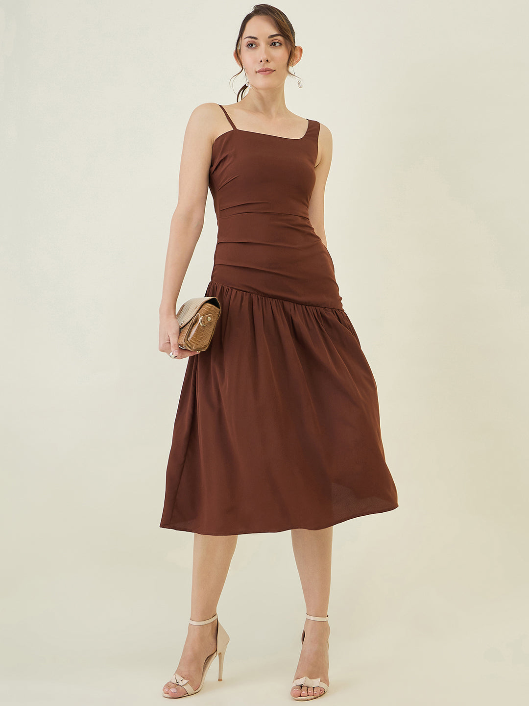 Elevate your casual or party wardrobe with this chic sleeveless midi dress. Crafted from soft Crepe fabric, this dress features a unique asymmetric strap and Square Neck bodice combined with a voluminous Flared skirt that hits at the calf. The comfortable, stylish fit makes this an effortless choice for special occasions.