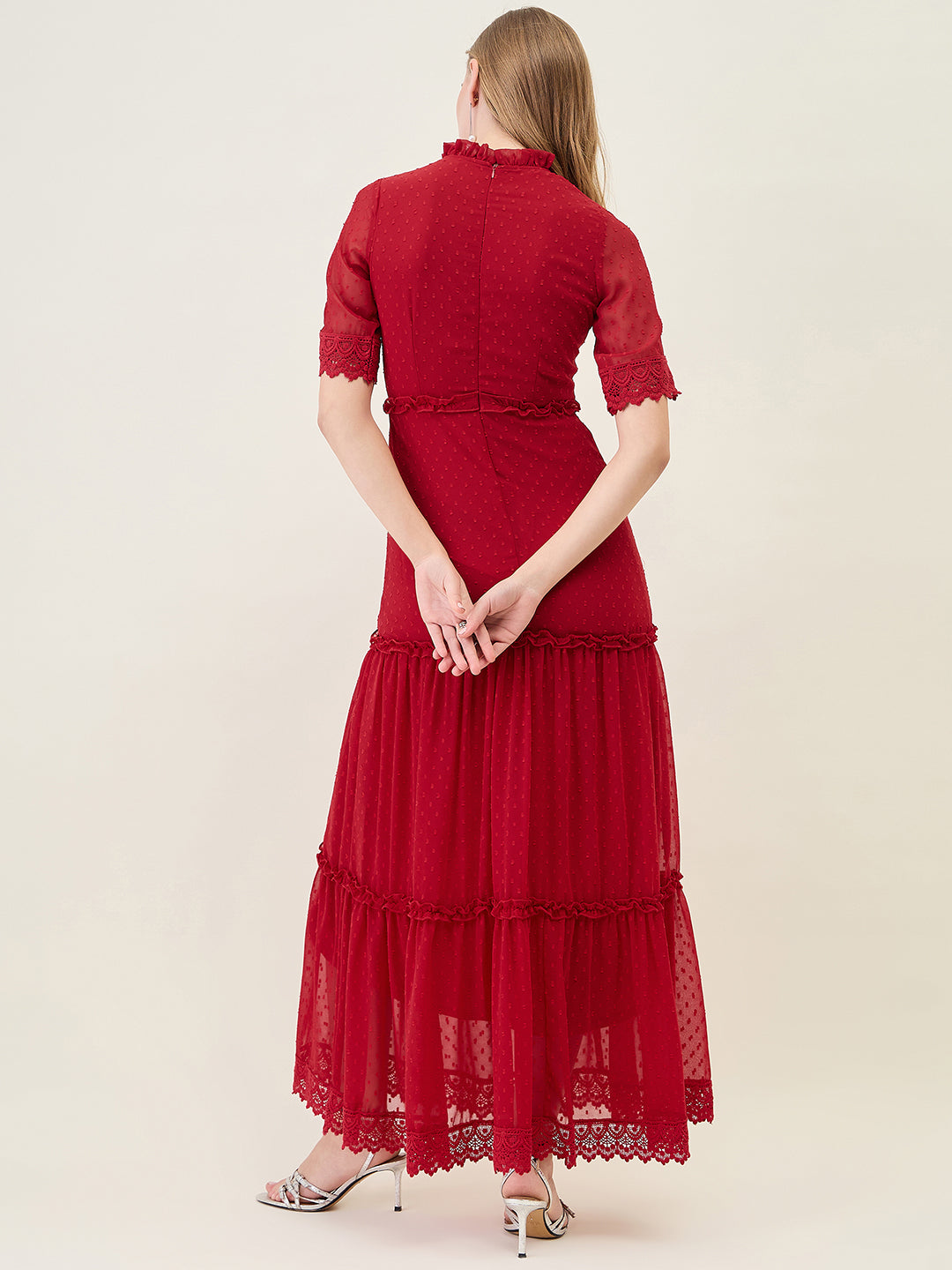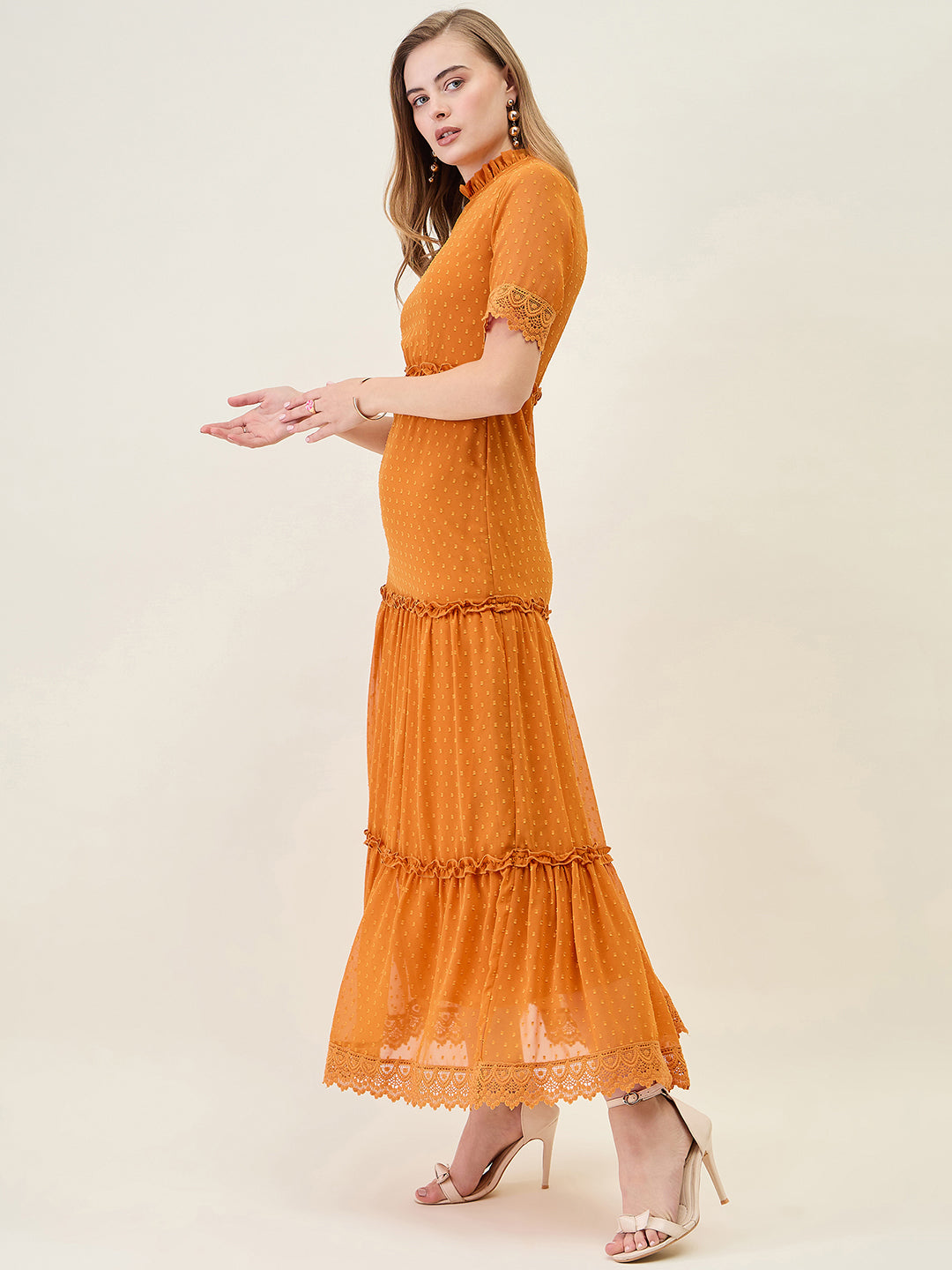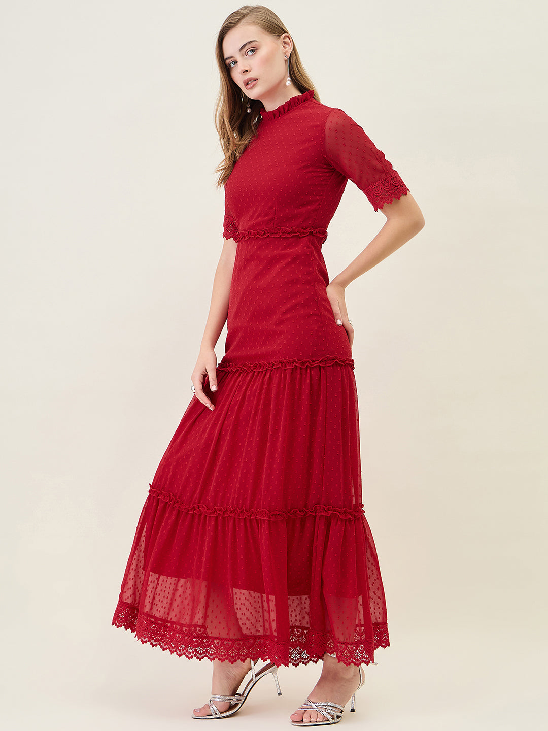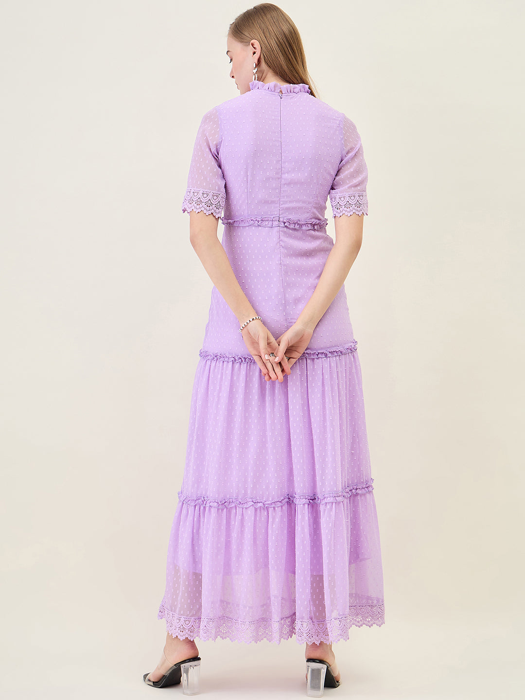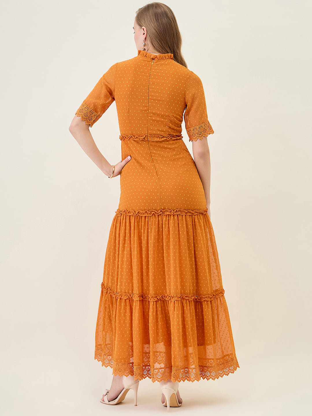 Step into any party or casual event with this stunning, full-length dress. Crafted from Georgette fabric with a sheer dobby (dot) texture, it features a ruffled Mandarin Collar and half sleeves finished with delicate lace trim. The silhouette offers a flowing, layered tiered skirt that creates beautiful movement with every step.