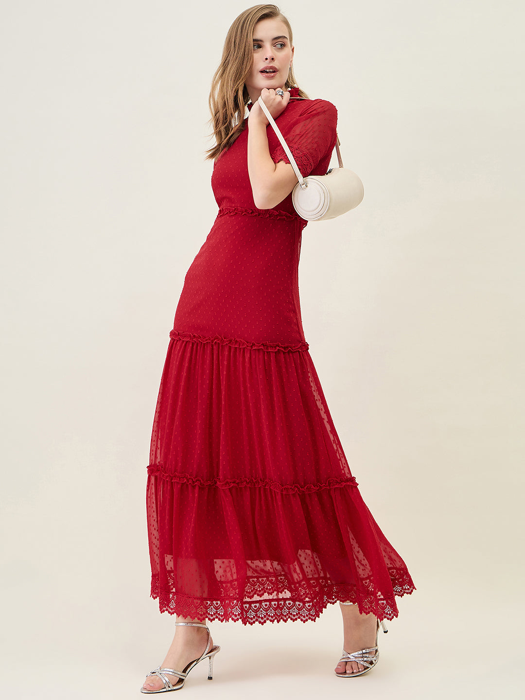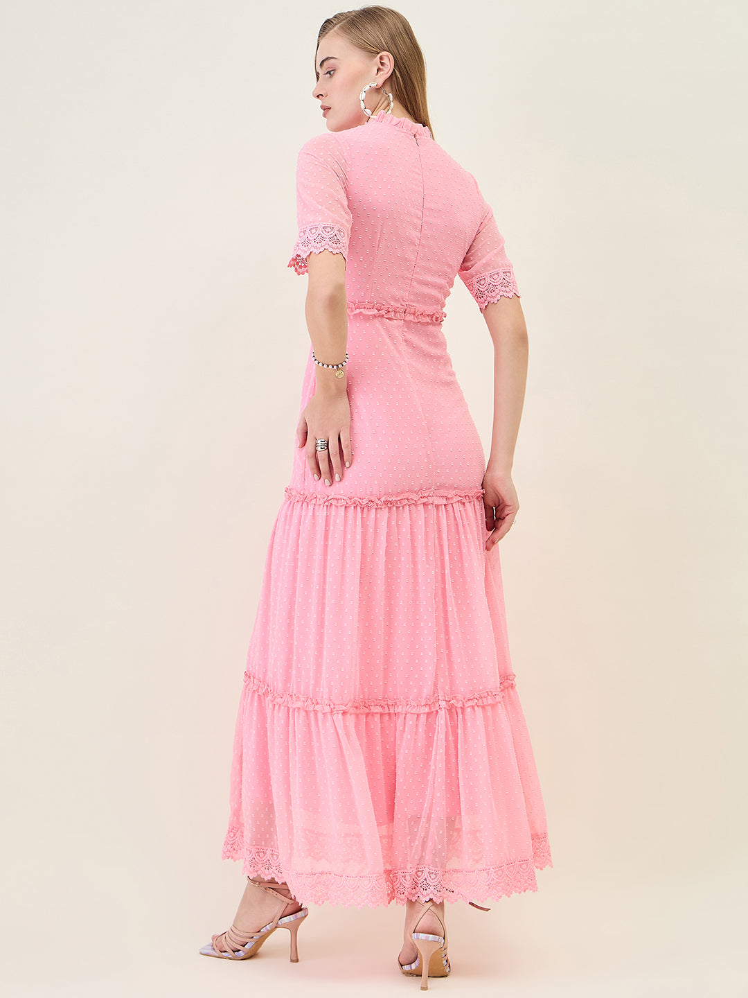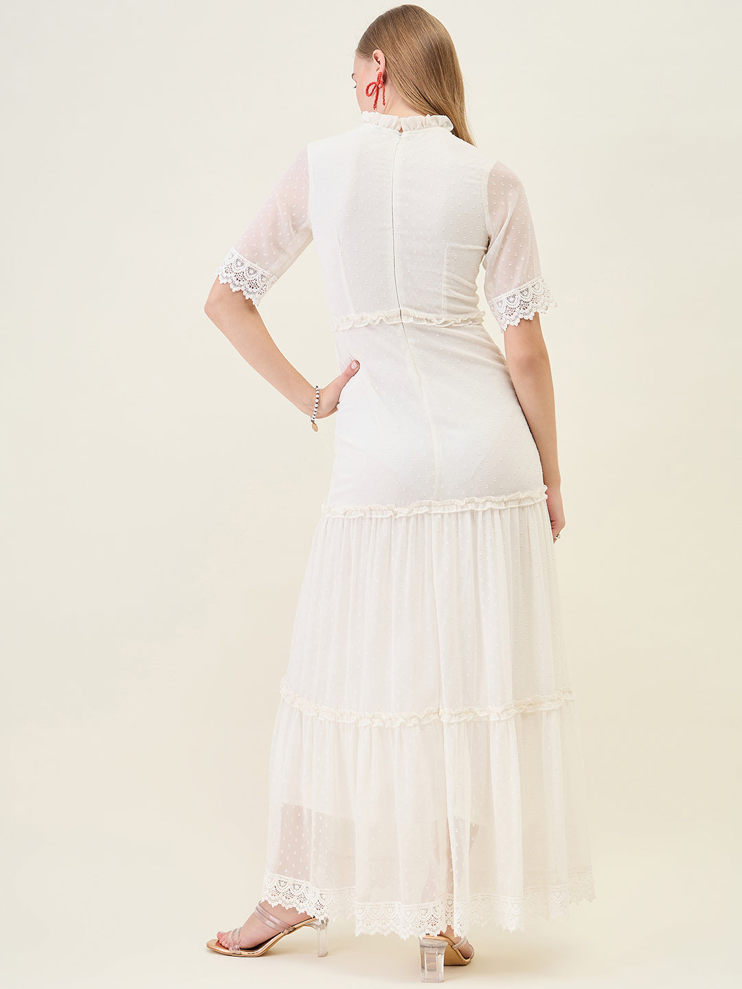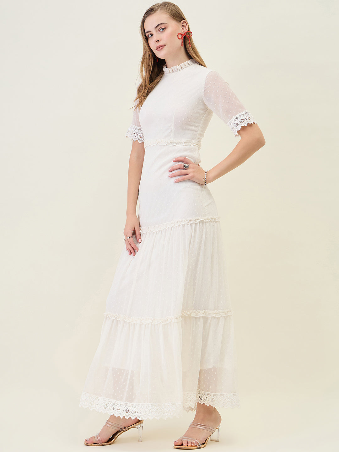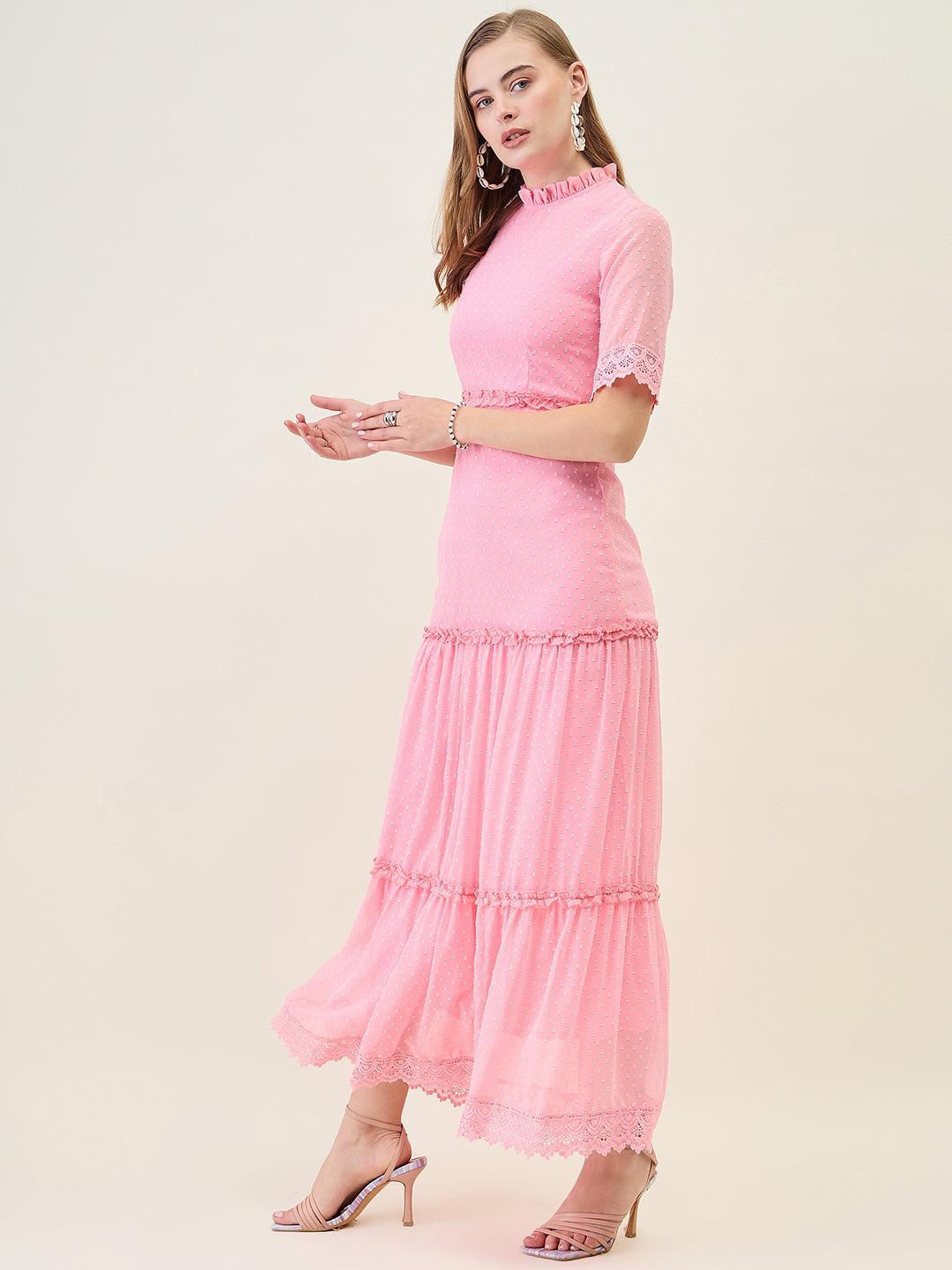 Step into any party or casual event with this stunning, full-length dress. Crafted from Georgette fabric with a sheer dobby (dot) texture, it features a ruffled Mandarin Collar and half sleeves finished with delicate lace trim. The silhouette offers a flowing, layered tiered skirt that creates beautiful movement with every step.