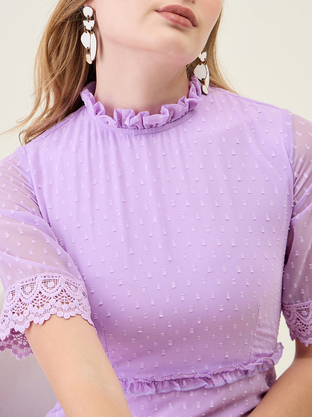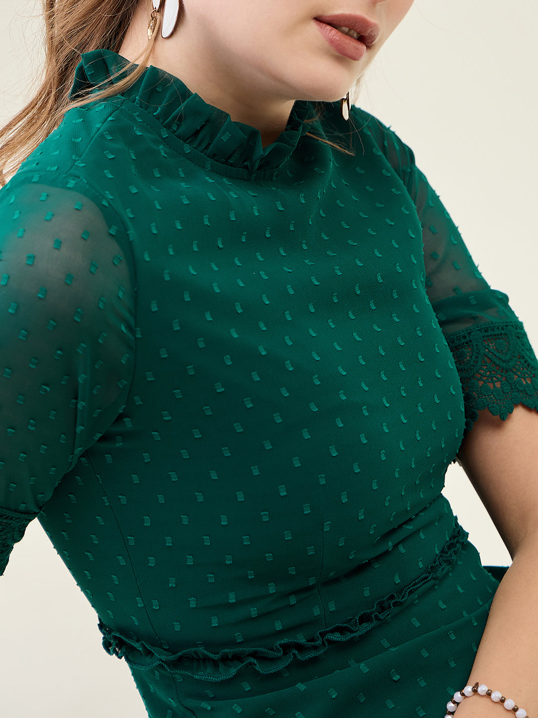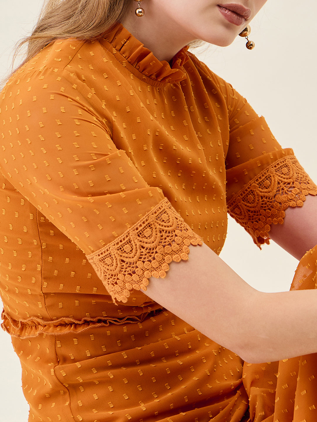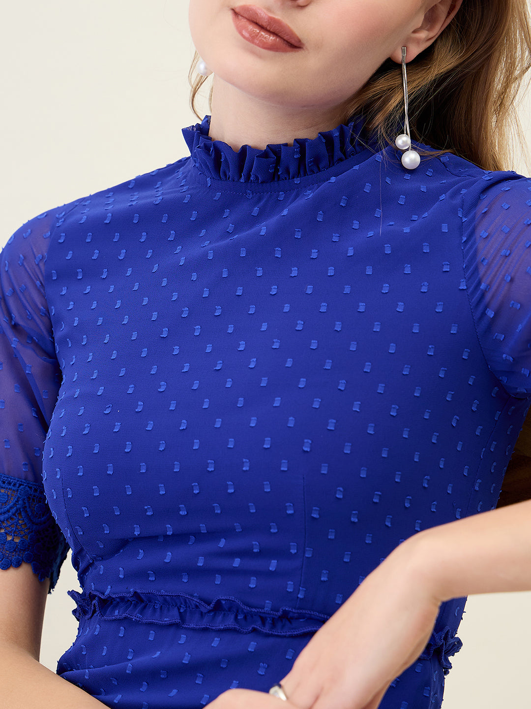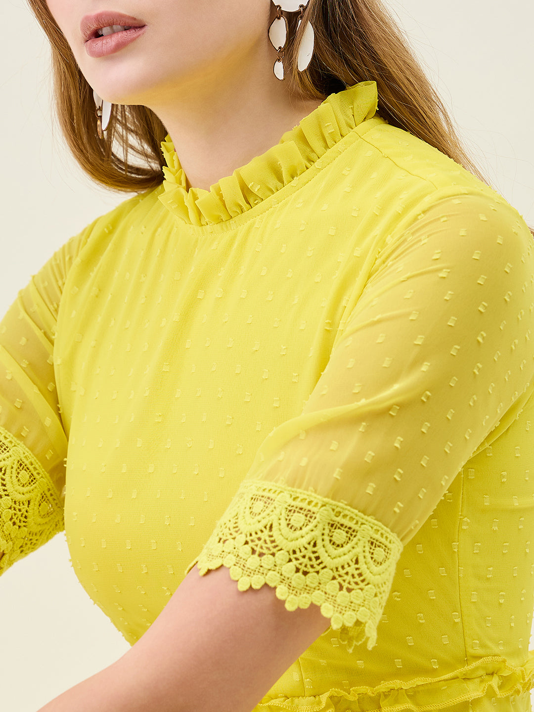 Step into any party or casual event with this stunning, full-length dress. Crafted from Georgette fabric with a sheer dobby (dot) texture, it features a ruffled Mandarin Collar and half sleeves finished with delicate lace trim. The silhouette offers a flowing, layered tiered skirt that creates beautiful movement with every step.