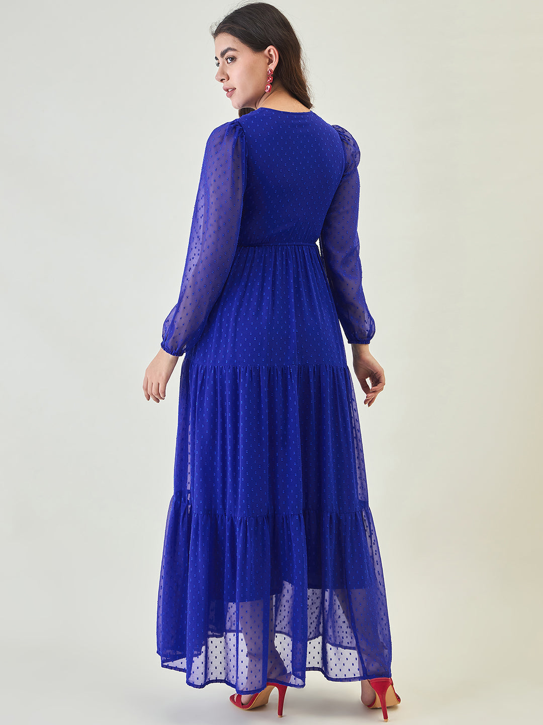 Grace any occasion in this flowing, full-sleeve maxi dress. Crafted from Georgette fabric with a subtle dobby texture, the design features a classic Round Neck with a partial button placket. The dress has an elegant Flared fit, accentuated by a self tie-waist detail and a voluminous tiered skirt for beautiful movement.