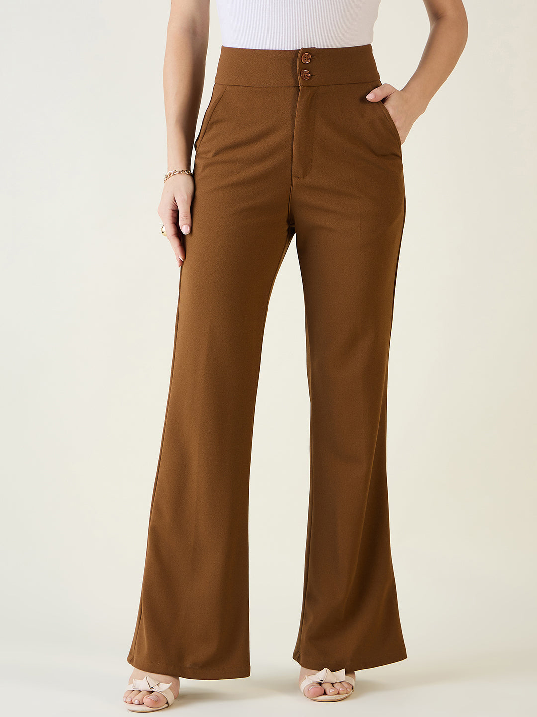 Achieve a polished, retro silhouette with these flattering flared trousers. Crafted from smooth Lycra Blend fabric, this style features a wide, Elevated Waist accented with decorative exposed buttons and functional slant pockets. The comfortable Regular Fit offers a sleek line from hip to the flared full-length hem.