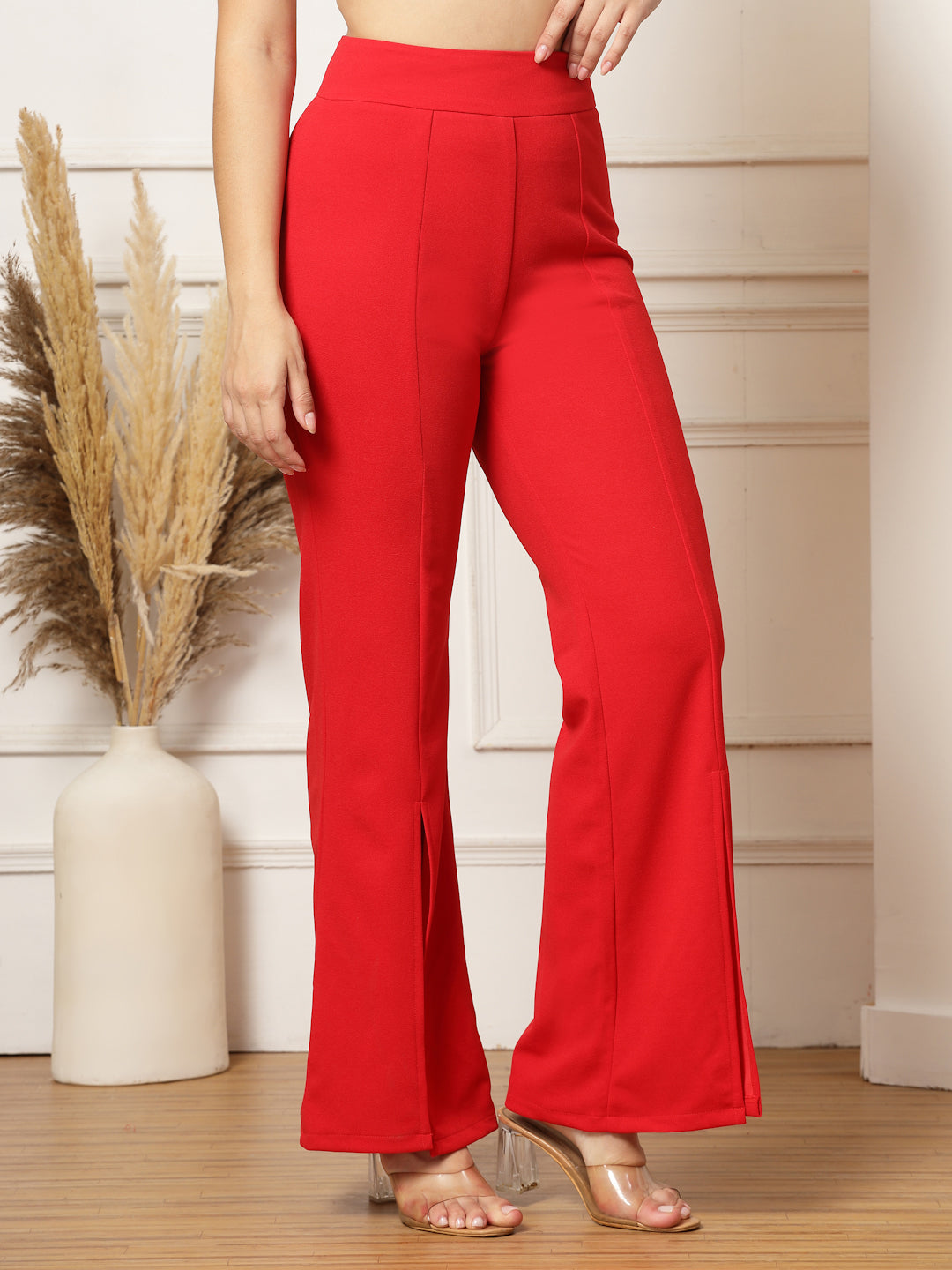 Achieve a modern, chic silhouette with these unique flared trousers. Crafted from smooth Lycra Blend fabric, this solid style features a sleek, Elevated Waist and a full-length, Flared hem. The design is finished with stylish vertical slits at the front ankle, adding striking detail to the leg.