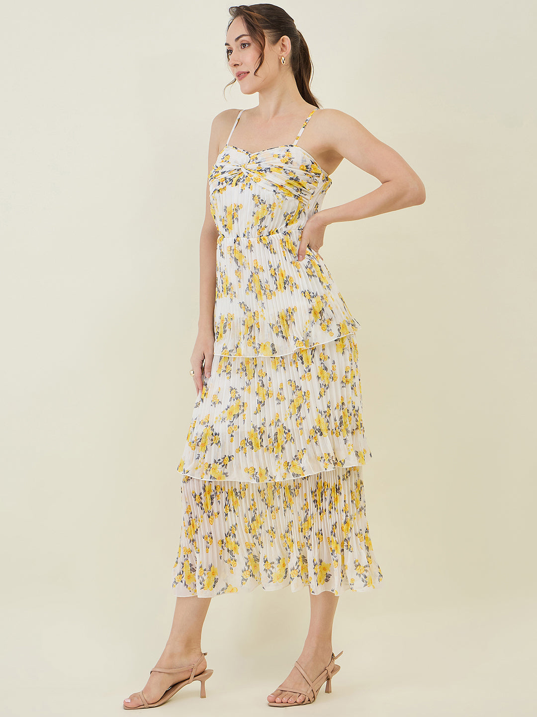 Float through your next casual or party event in this airy floral midi dress. Crafted from soft Georgette fabric, this sleeveless design features delicate noodle straps and a flattering square neck. The bodice has a twisted/gathered detail leading to a voluminous tiered skirt with elegant all-over pleats for beautiful movement.
