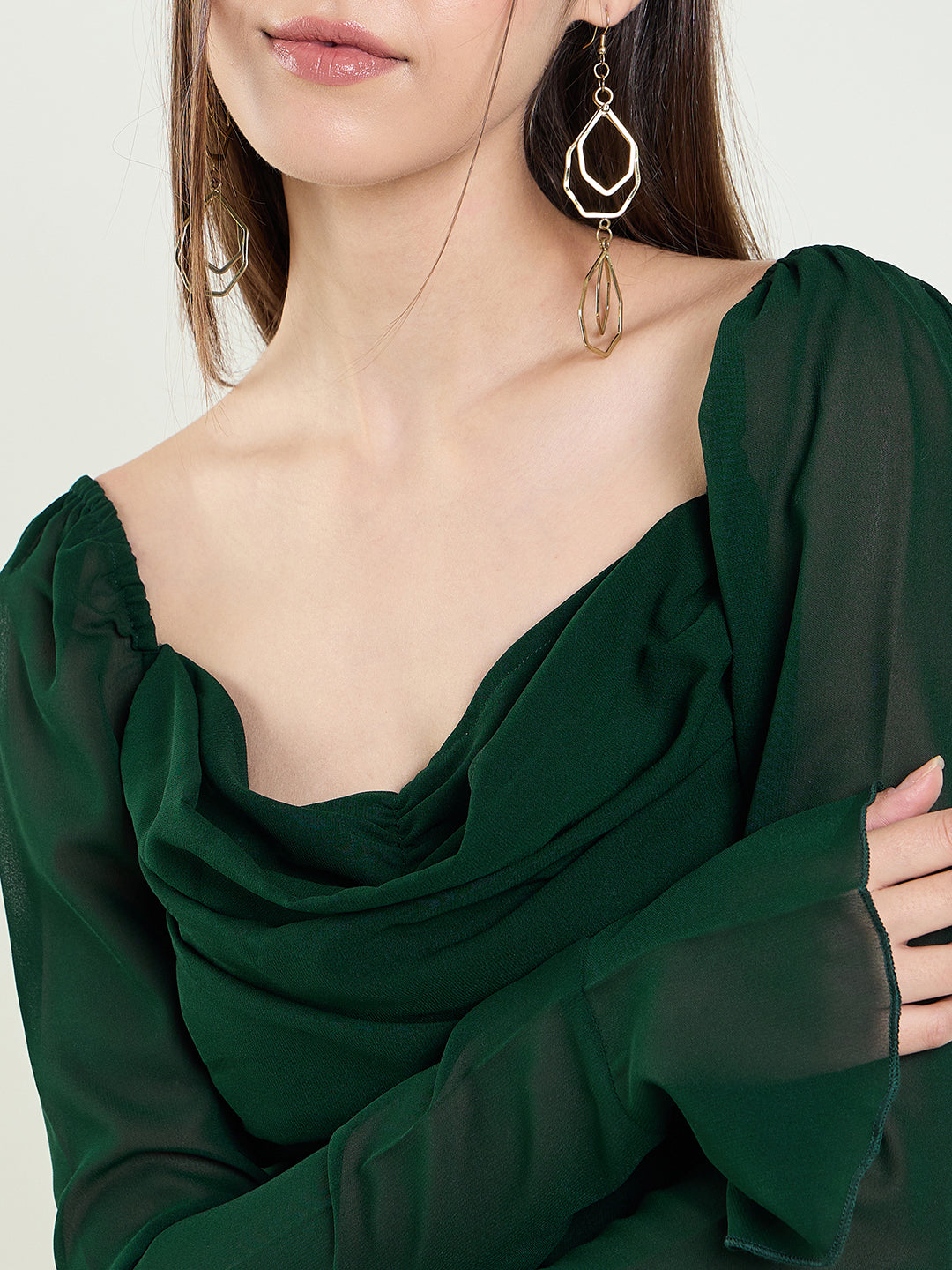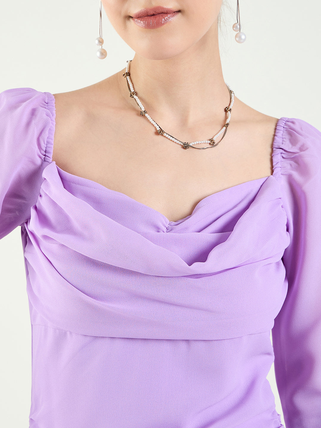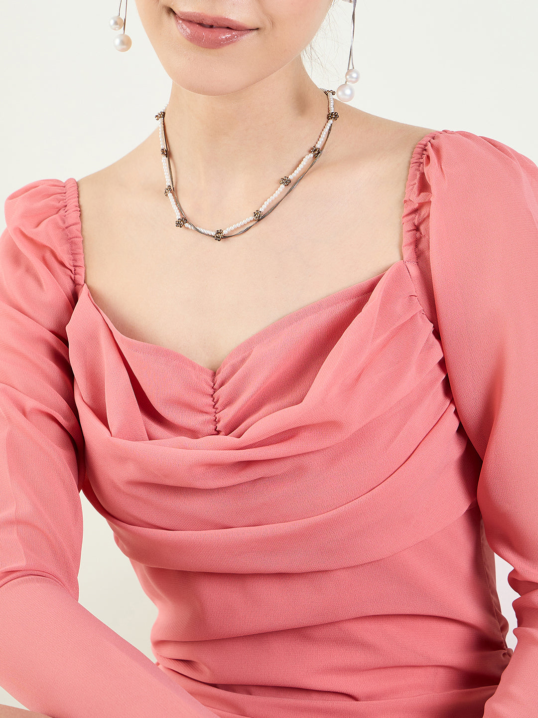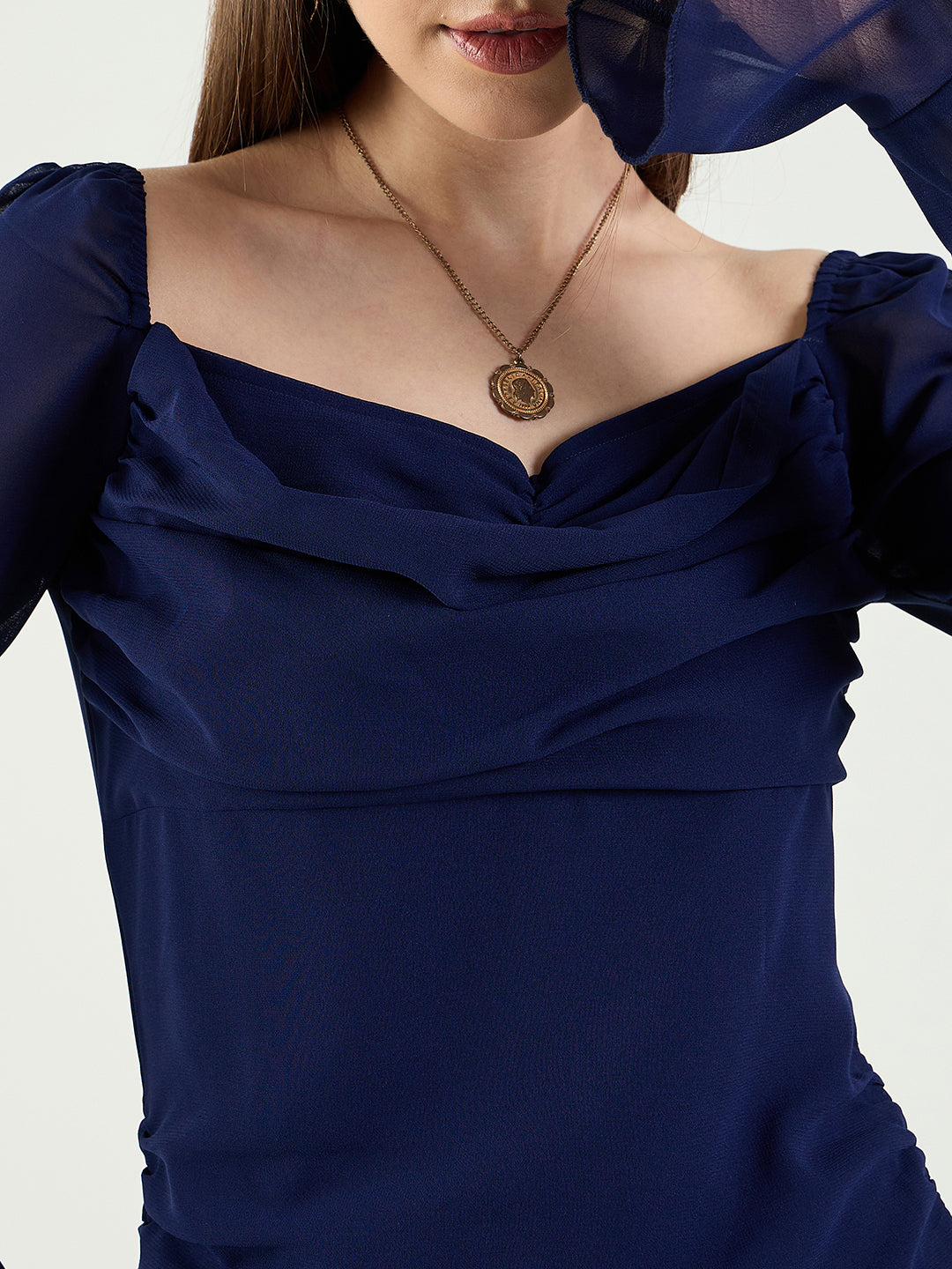 Step out in this elegant long-sleeve mini dress, perfect for parties or special occasions. Crafted from soft Georgette fabric with lining, this dress features all-over ruching for a figure-flattering Bodycon fit. The design includes a graceful Sweetheart Neck and sheer full sleeves with cuff details.