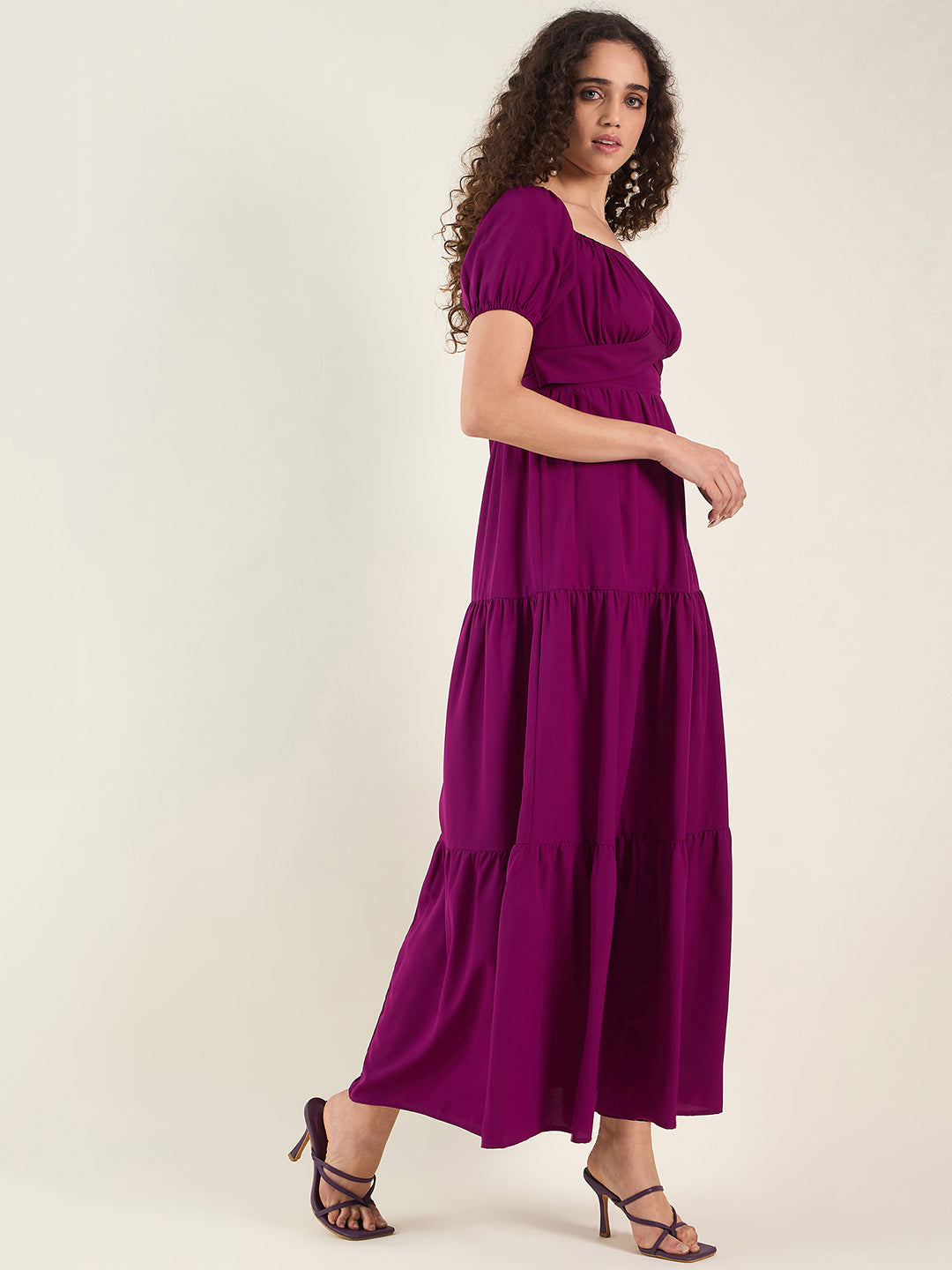 Achieve effortless elegance in this comfortable solid maxi dress, ideal for weddings, parties, or stylish casual wear. Crafted from soft Crepe fabric, the dress features charming short puff sleeves and a flattering Square Neck. Its voluminous tiered skirt is cinched by a detachable self-tie belt for a perfect Flared fit.