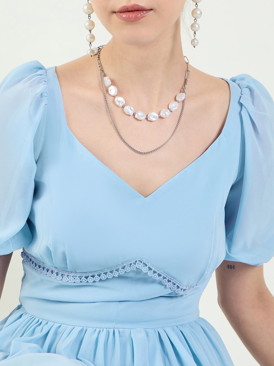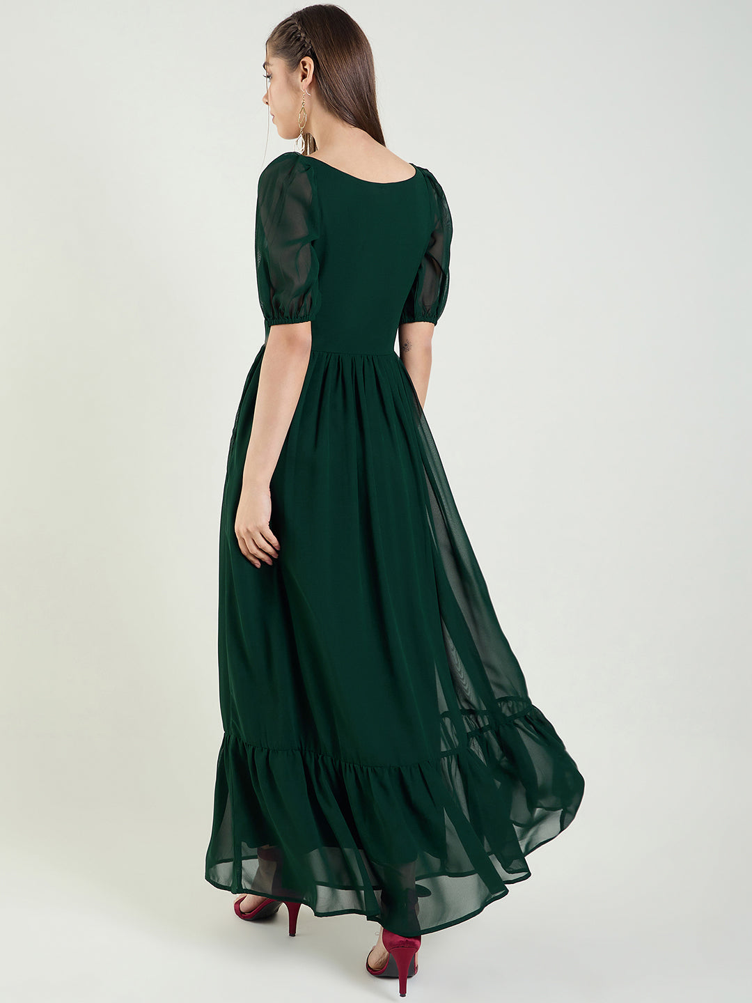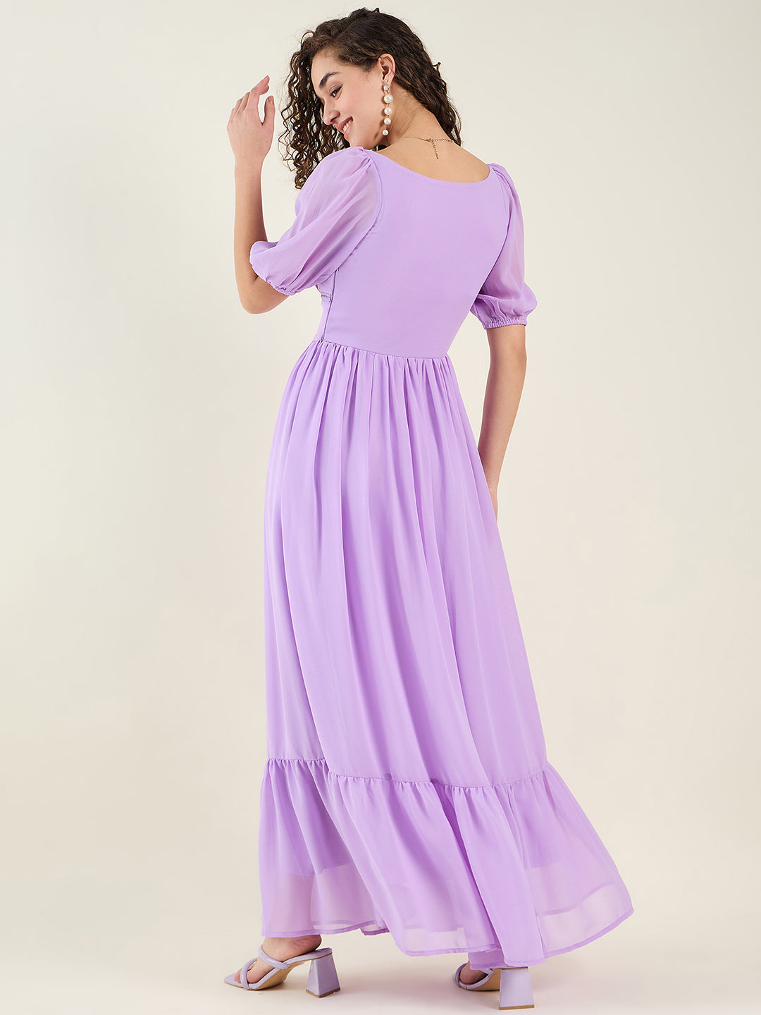 Walk gracefully into any event with this flowing, elegant maxi dress. Crafted from sheer Georgette fabric with lining, this design features charming half puff sleeves and a flattering Sweetheart Neck. The bodice is detailed with delicate lace trim, while the Maxi/Full Length skirt finishes with a voluminous, wide ruffle hem.