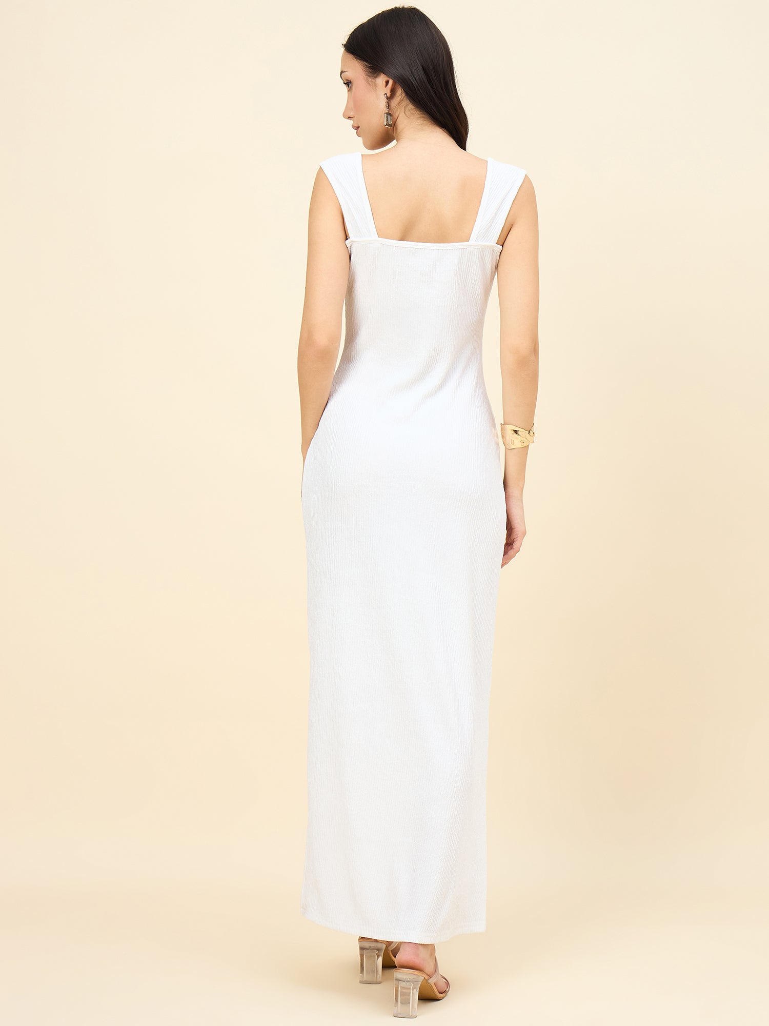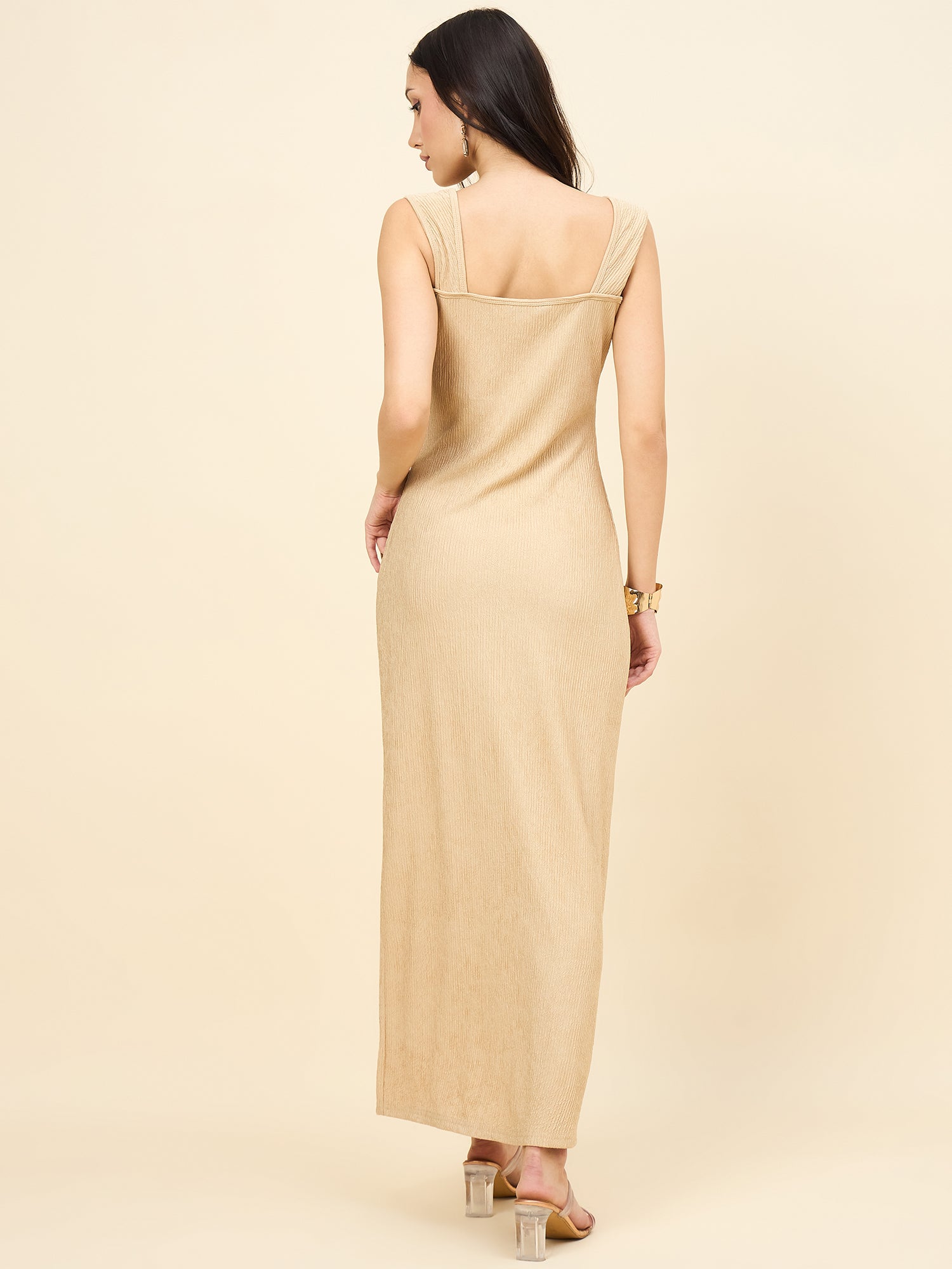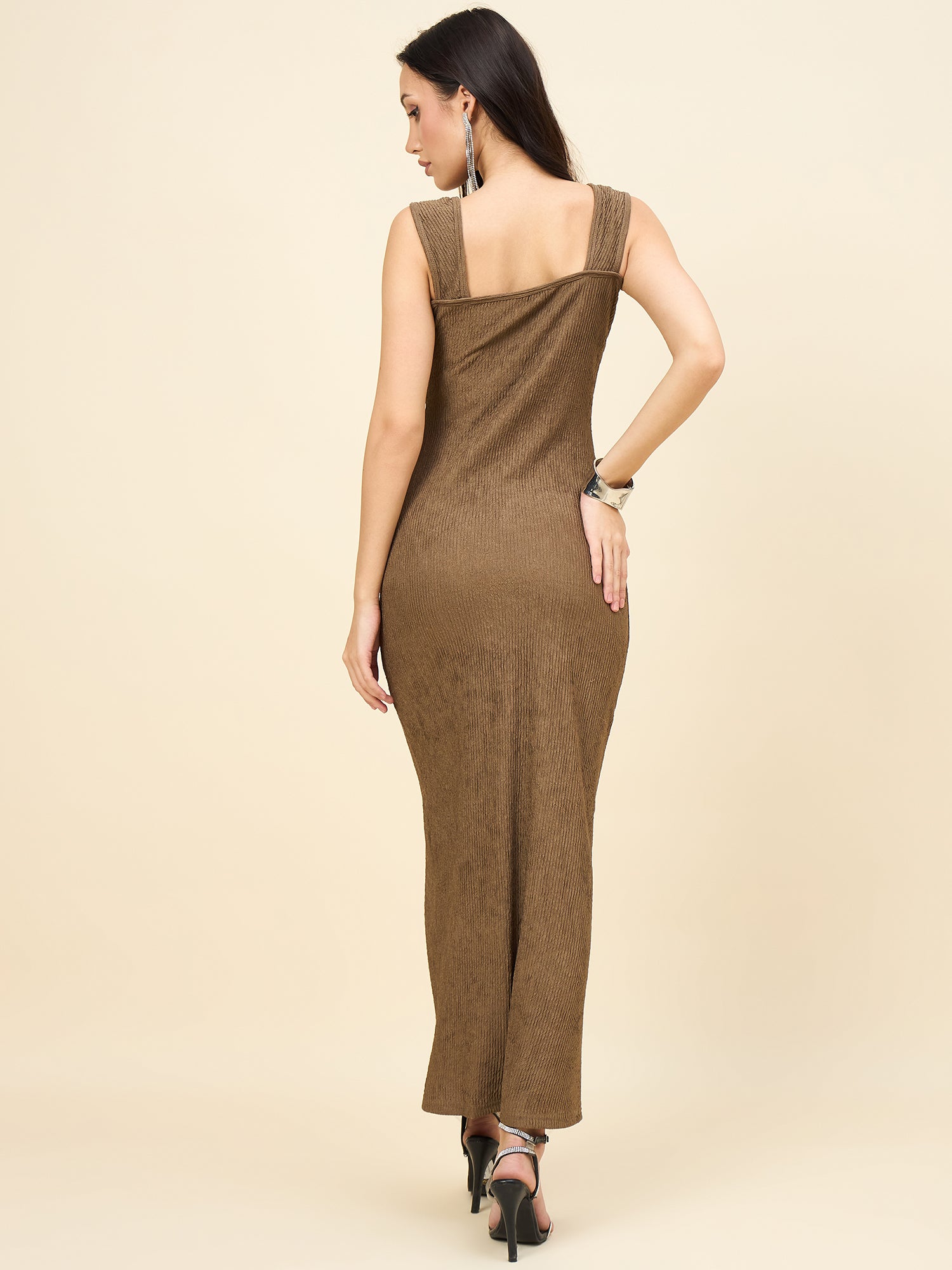 Achieve a sleek, figure-flattering silhouette with this elegant sleeveless maxi dress. Crafted from soft, textured Lycra Blend fabric, this style features a wide Square Neck and broad tank straps. The Bodycon fit extends to a Maxi/Full Length, making it a comfortable yet sophisticated choice for parties or elevated casual occasions.