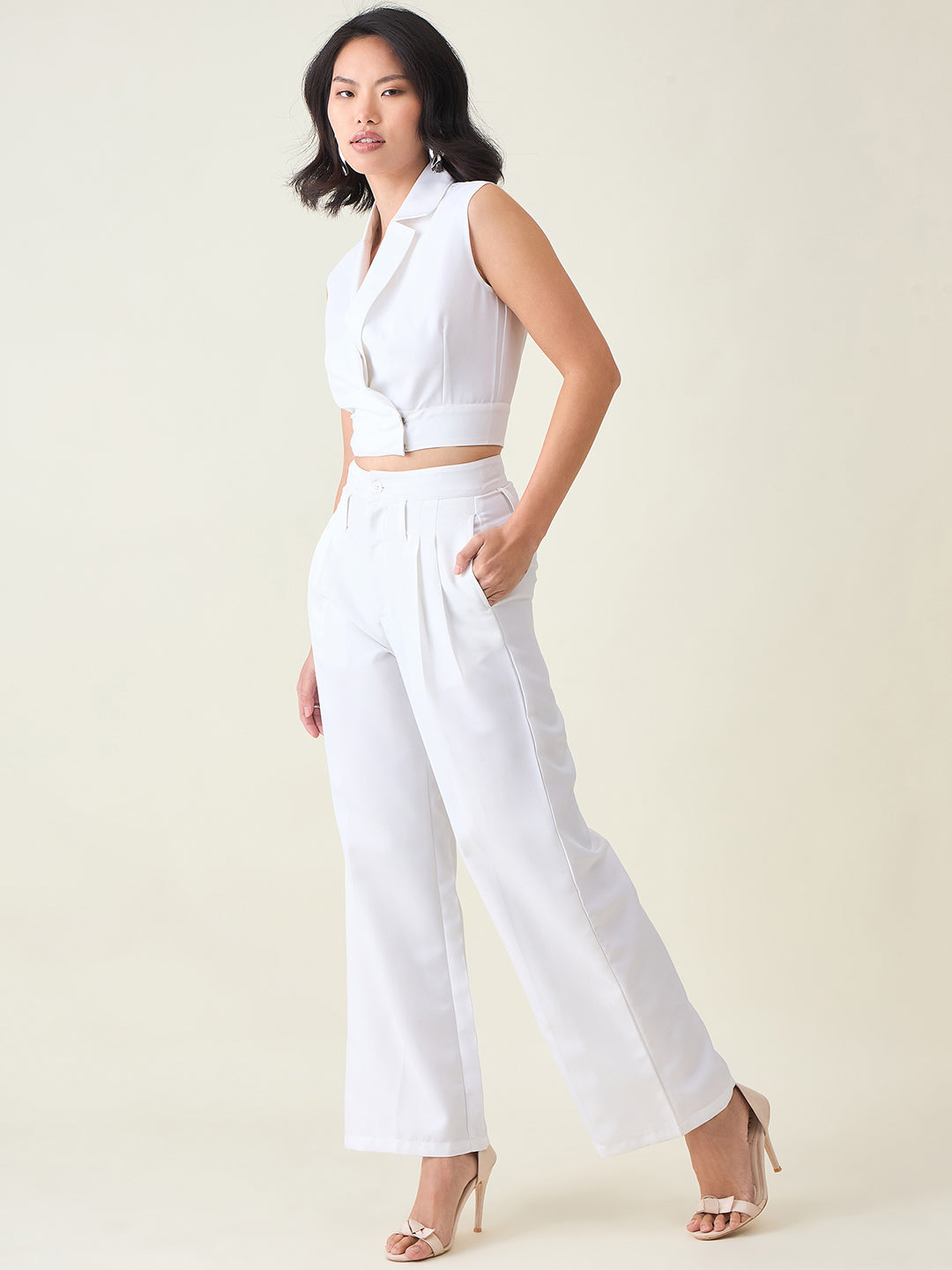Achieve sharp, modern office style with this two-piece co-ord set. The sleeveless waistcoat top features a chic Spread Collar and a flattering wrap front. It's paired with coordinating full-length pleated trousers that have a High Waist and functional pockets, making this Polycotton set ideal for formal or elevated casual wear.