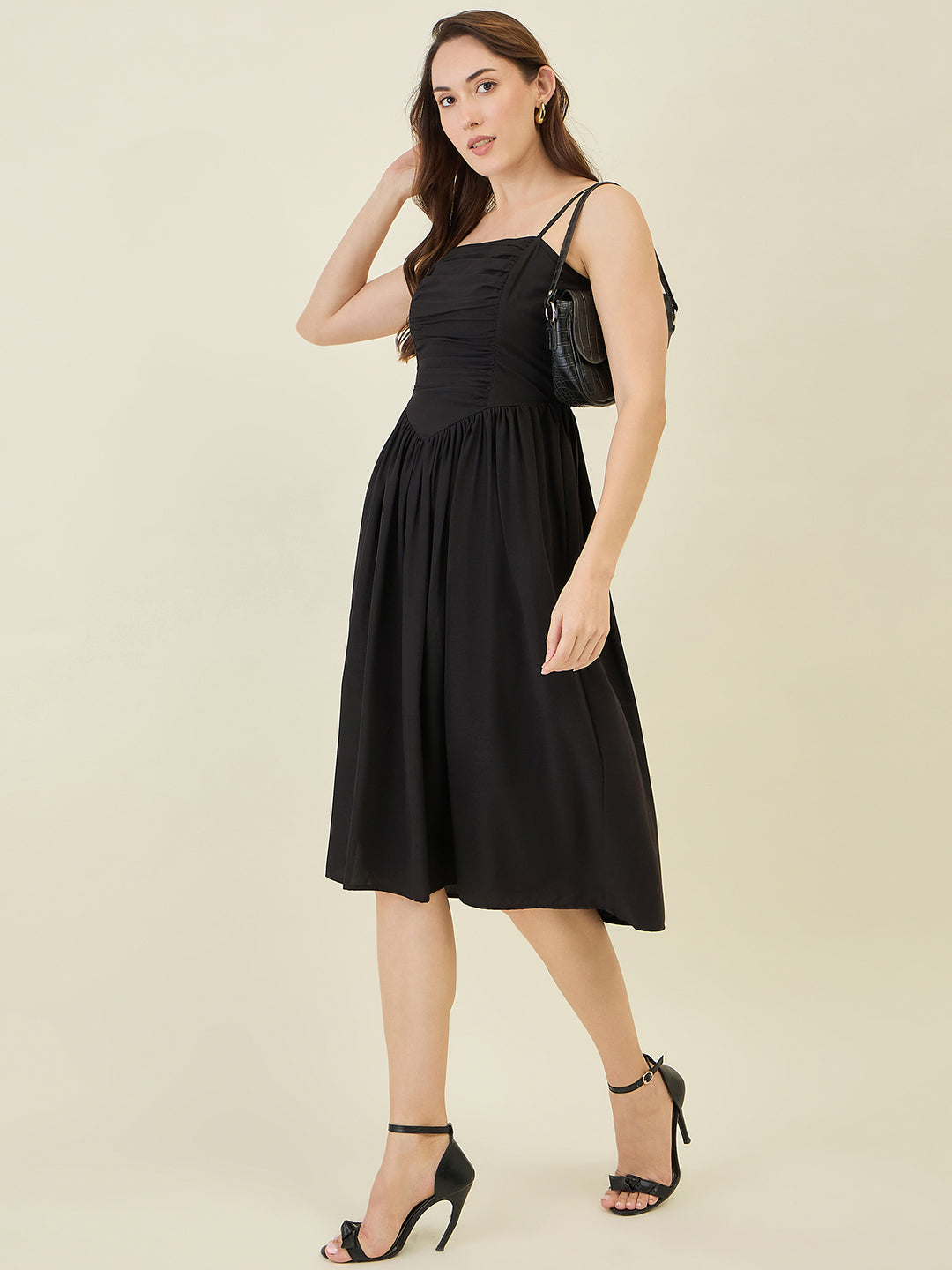 Look effortless in this timeless sleeveless midi dress, perfect for casual or wedding occasions. Crafted from soft Crepe fabric, the design features delicate noodle straps and a Square Neck bodice with flattering smocking/gathering detail. Its comfortable Fit & Flare skirt falls to a Below Knee length, creating a versatile and elegant look.