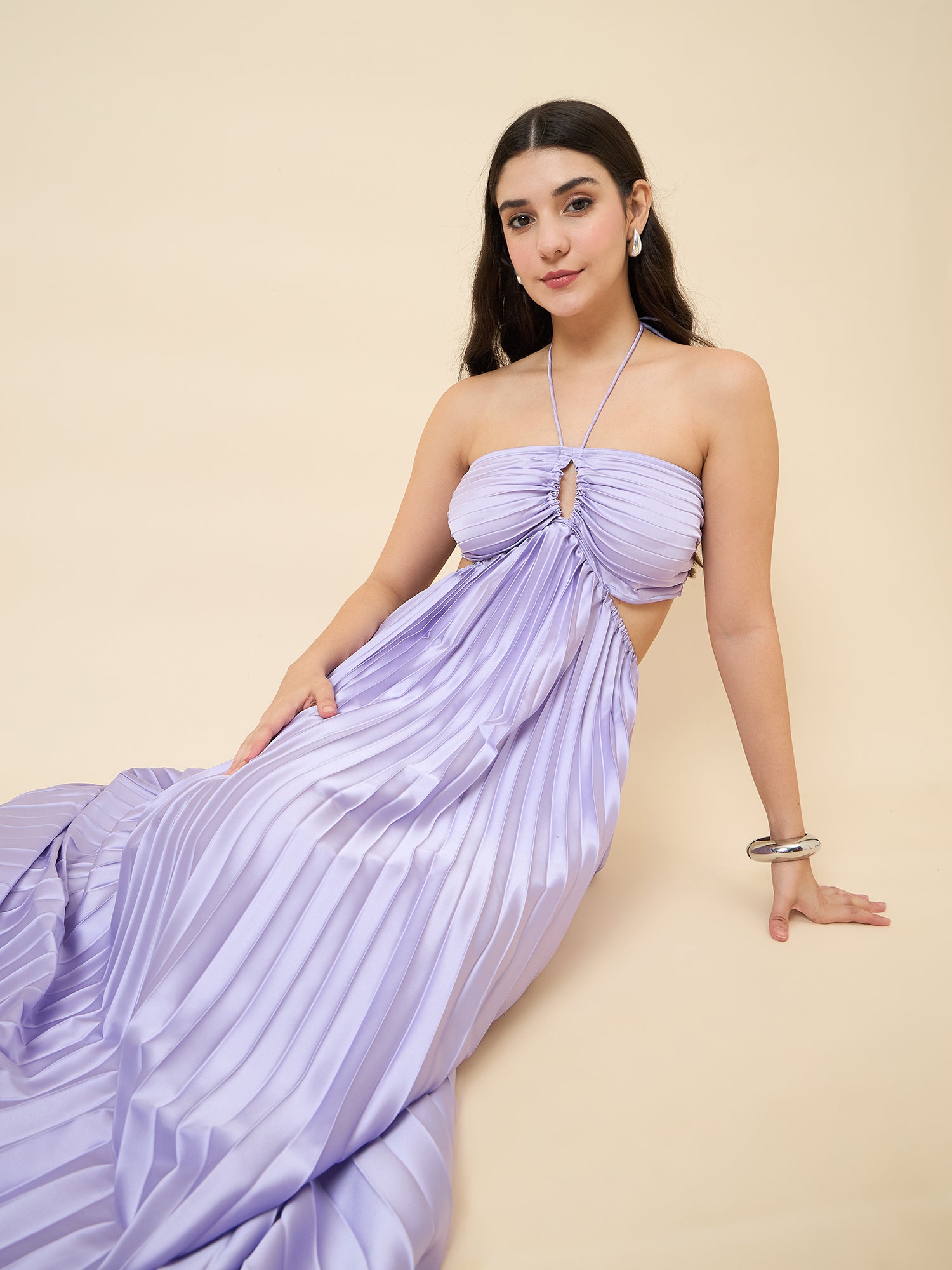 Elegant satin maxi dress with halter neck, sleeveless design, all-over pleats and gathers for a flared silhouette. Luxuriously soft and shiny fabric, perfect for parties, weddings, and special evening occasions.