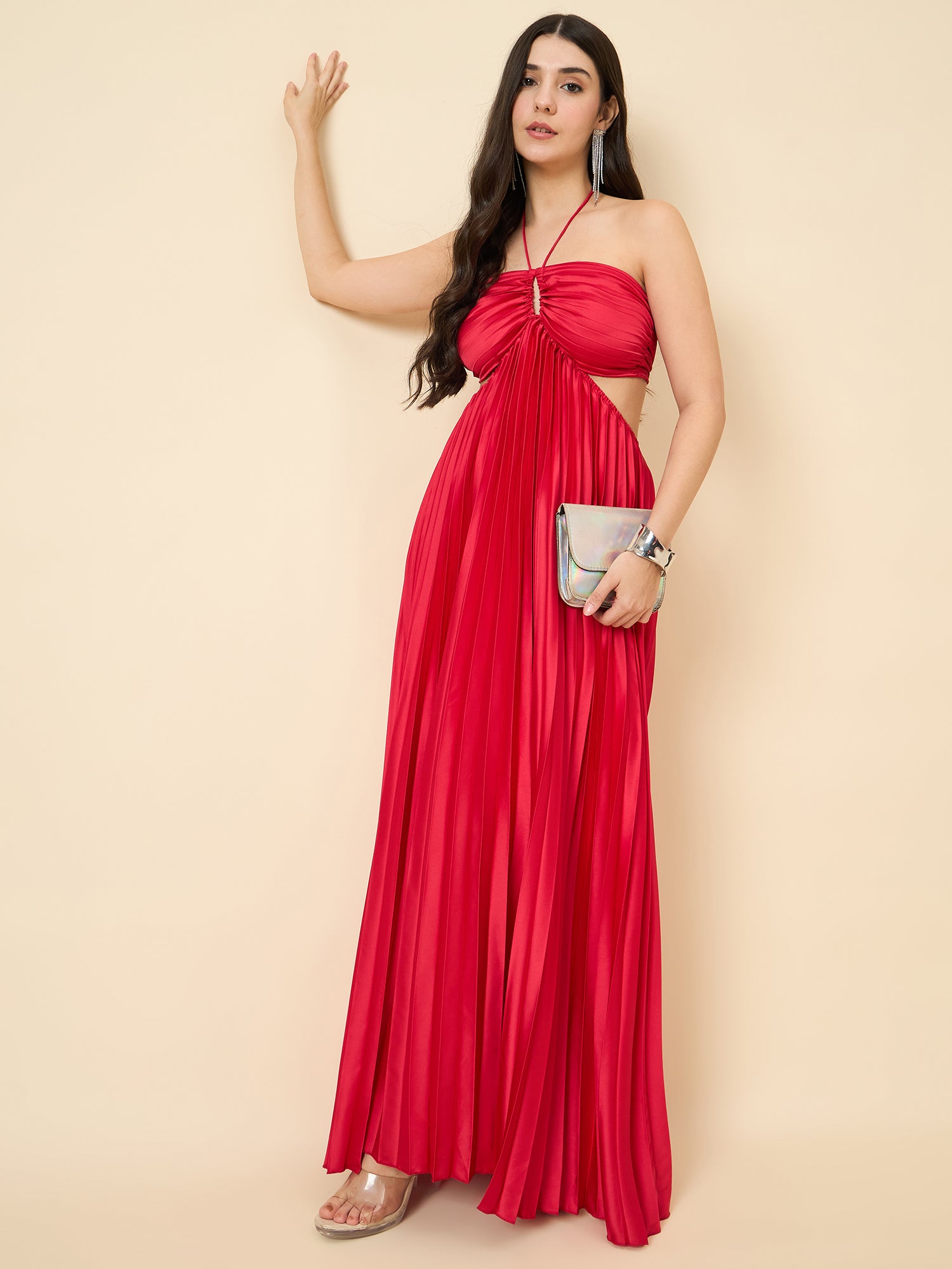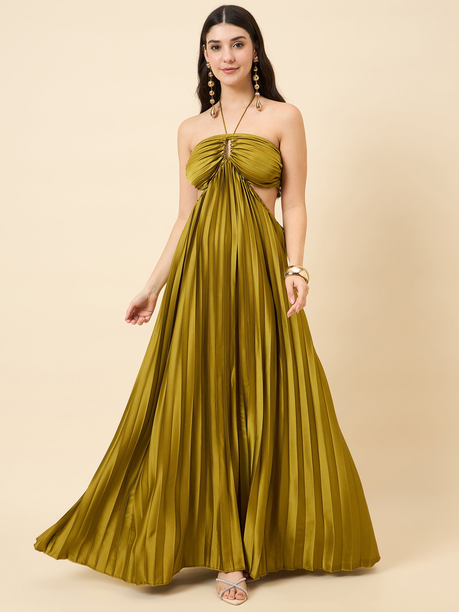Solid Halter Neck Pleated Satin Maxi Dress