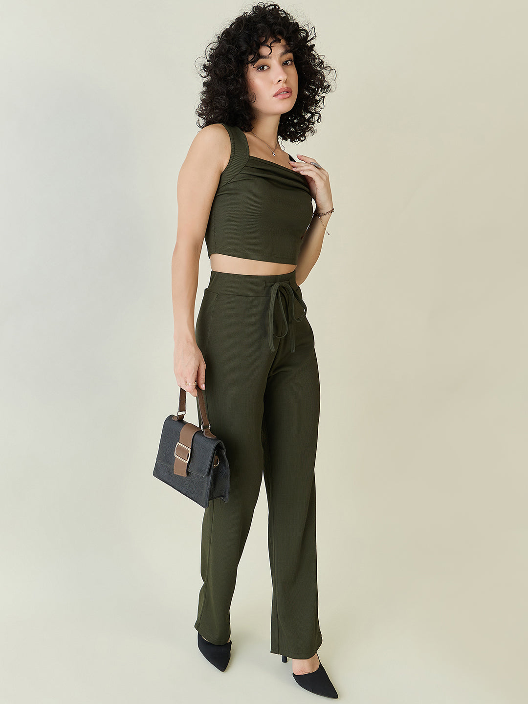 Achieve an effortless, chic look with this two-piece co-ord set. The sleeveless crop top features a modern Square Neck and comfortable textured knit. It's paired with matching full-length trousers that have a comfortable High Waist and adjustable drawstring closure, making this textured knit set perfect for stylish casual wear.