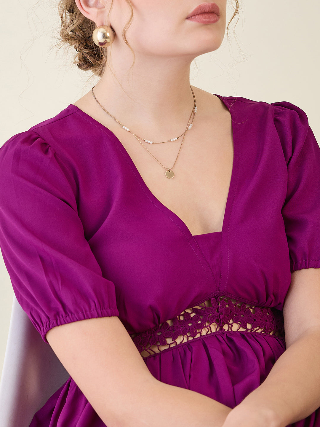 This elegant midi dress is perfect for a party or wedding guest look. Crafted from comfortable Crepe fabric, the design features a flattering V-Neck, half puff sleeves, and a flowing A-line silhouette. The waist is detailed with an exquisite lace inset, giving this stylish piece a delicate, refined touch.