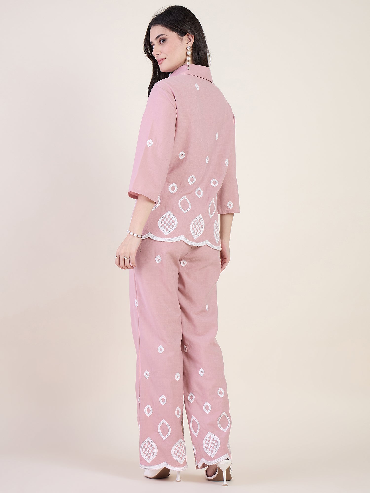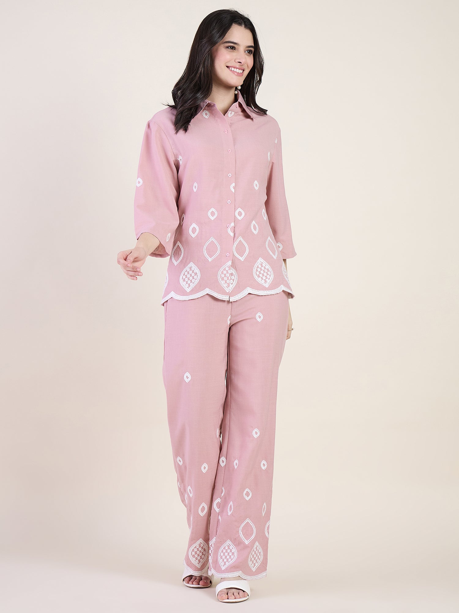 Complementing the top are beautifully designed full-length pants featuring mid-waist styling with an elastic waistband for effortless comfort. The straight-fit silhouette flatters all body types while maintaining a relaxed, comfortable feel.