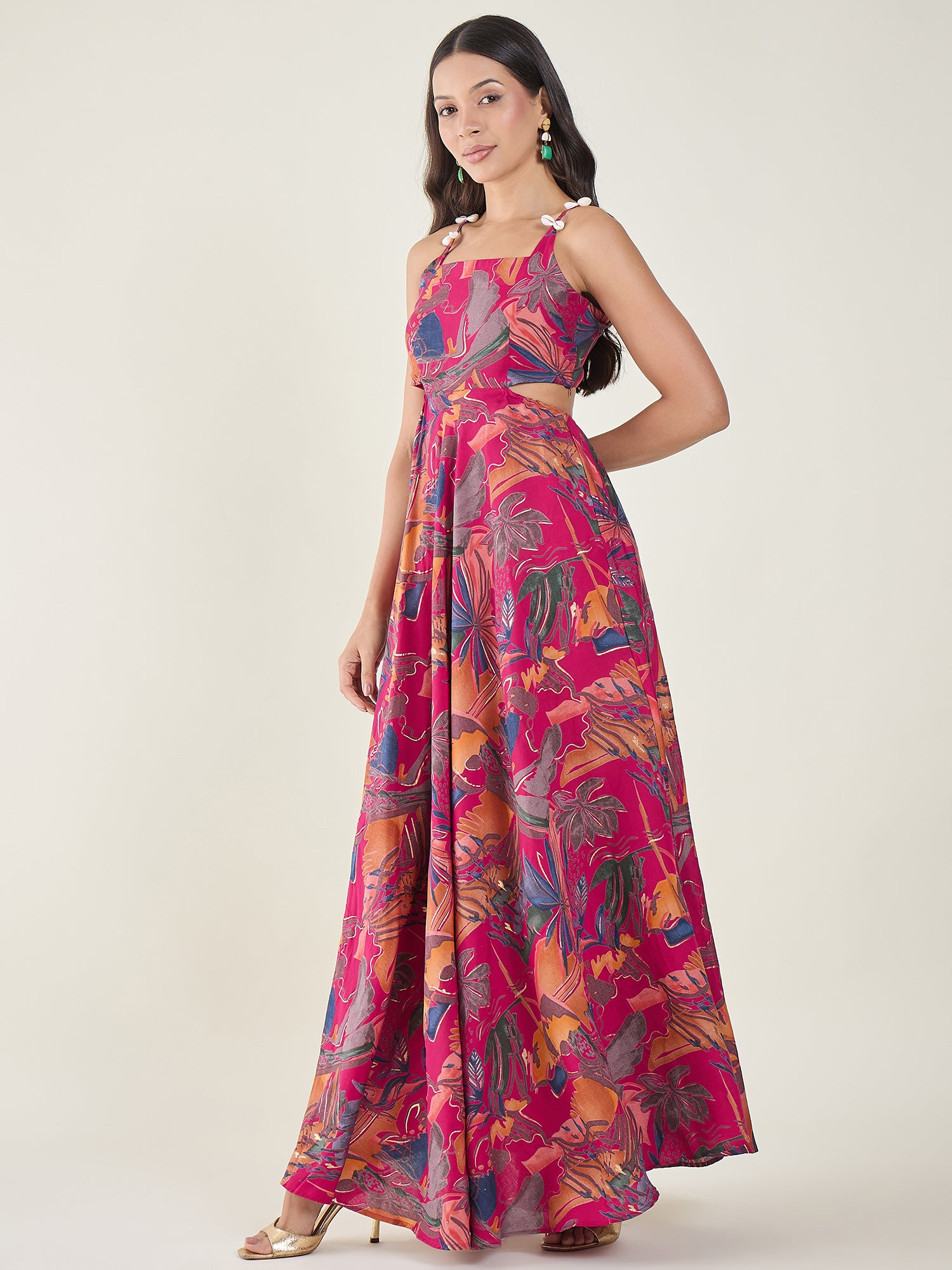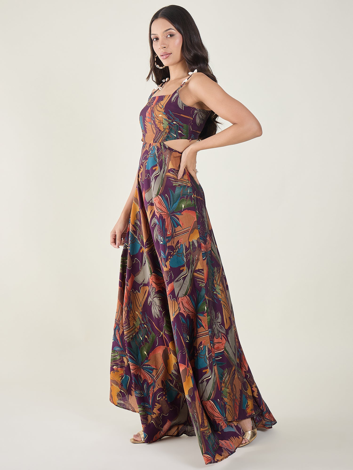 Elevate your vacation wardrobe with this printed A-line maxi. Featuring a sleek square neck and unique shell embellished shoulder straps, this ensemble is defined by its chic waist cut-outs and a dramatic flared silhouette that moves beautifully with every step.